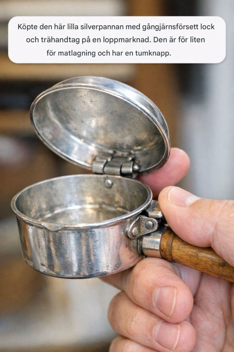 Gårdsförsäljningar är en skattkammare för den som har ett skarpt öga och en kärlek till historia. Bland den eklektiska blandningen av hushållsartiklar och bortglömda antikviteter kan man ofta hitta unika föremål som väcker nyfikenhet och fantasi. Ett sådant fynd var en liten silverpanna med gångjärnsförsett lock och ett trähandtag, till synes för liten för praktiskt bruk i köket.