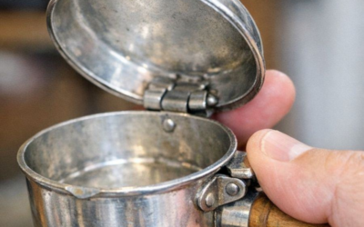Köpte den här lilla silverpannan med gångjärnsförsett lock och trähandtag på en loppmarknad. Den är för liten för matlagning och har en tumknapp.